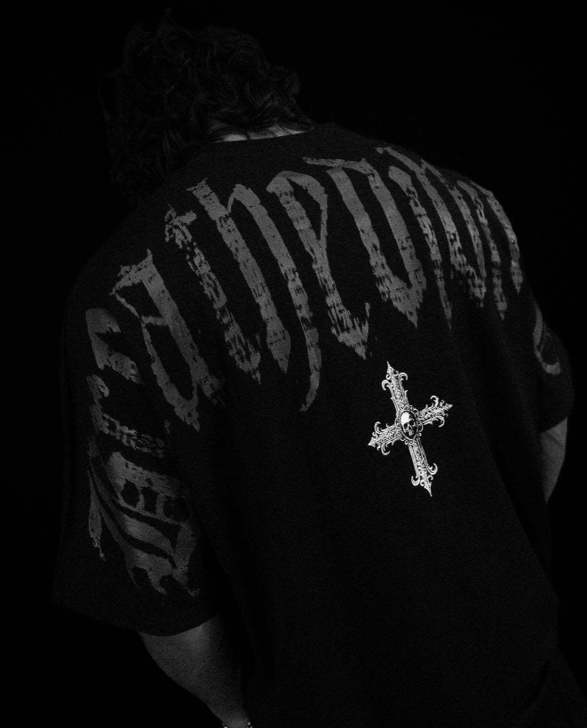 Gráfico "White Cross" de Alta Densidad: Una cruz blanca imponente, con detalles de tipografía gótica, serigrafiada con tintas de máxima durabilidad que resaltan con violencia sobre el negro profundo de la prenda.