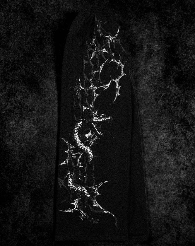 El movimiento de una serpiente es silencioso, letal y preciso; exactamente como debería ser tu progreso. Los Pants "Viper Crypt" de BreatheDivinity han sido invocados desde lo más profundo de la estética gótica para ofrecerte una prenda que no solo viste, sino que impone. Con un diseño de escamas y serpientes que se entrelazan en la oscuridad, estos pants son la pieza definitiva para el atleta que busca una imagen oscura, poderosa y sofisticada.