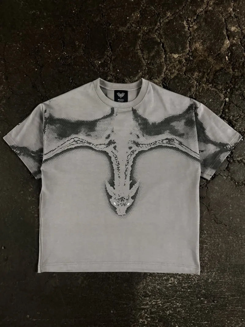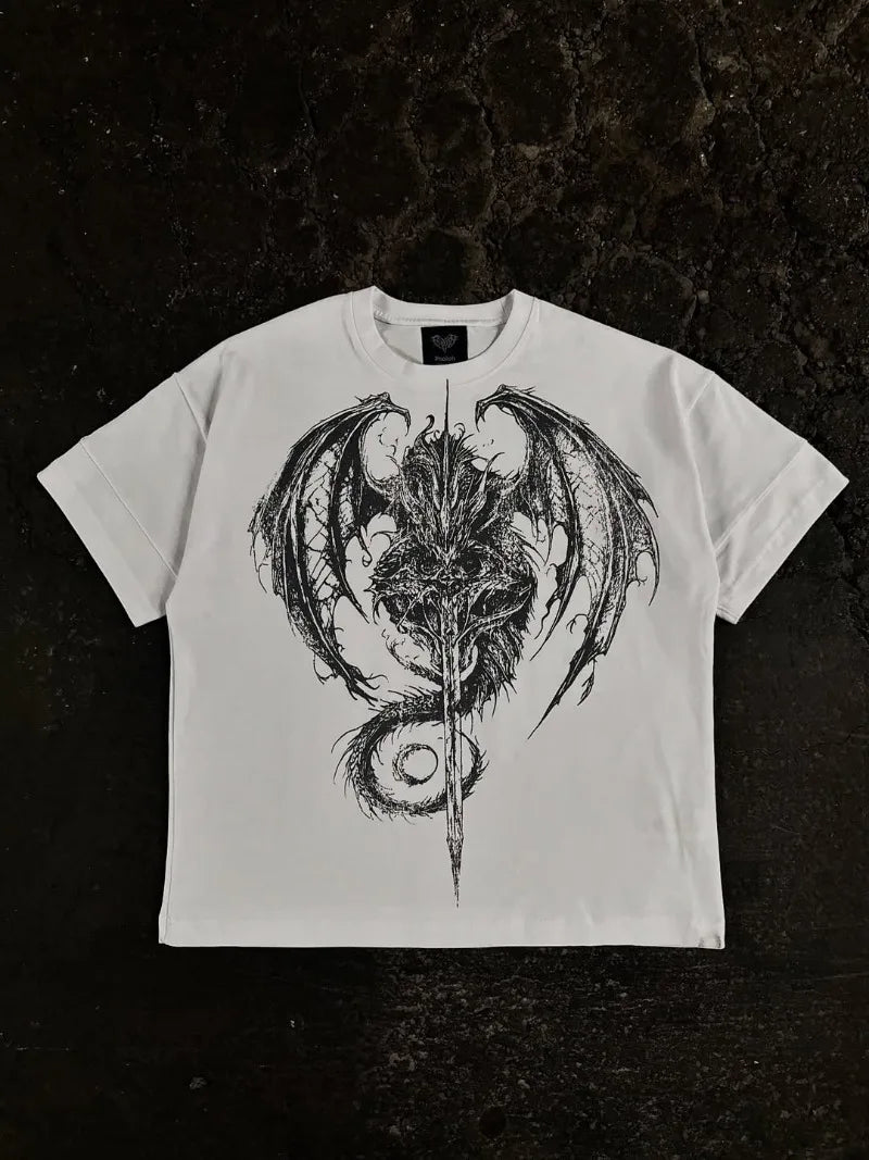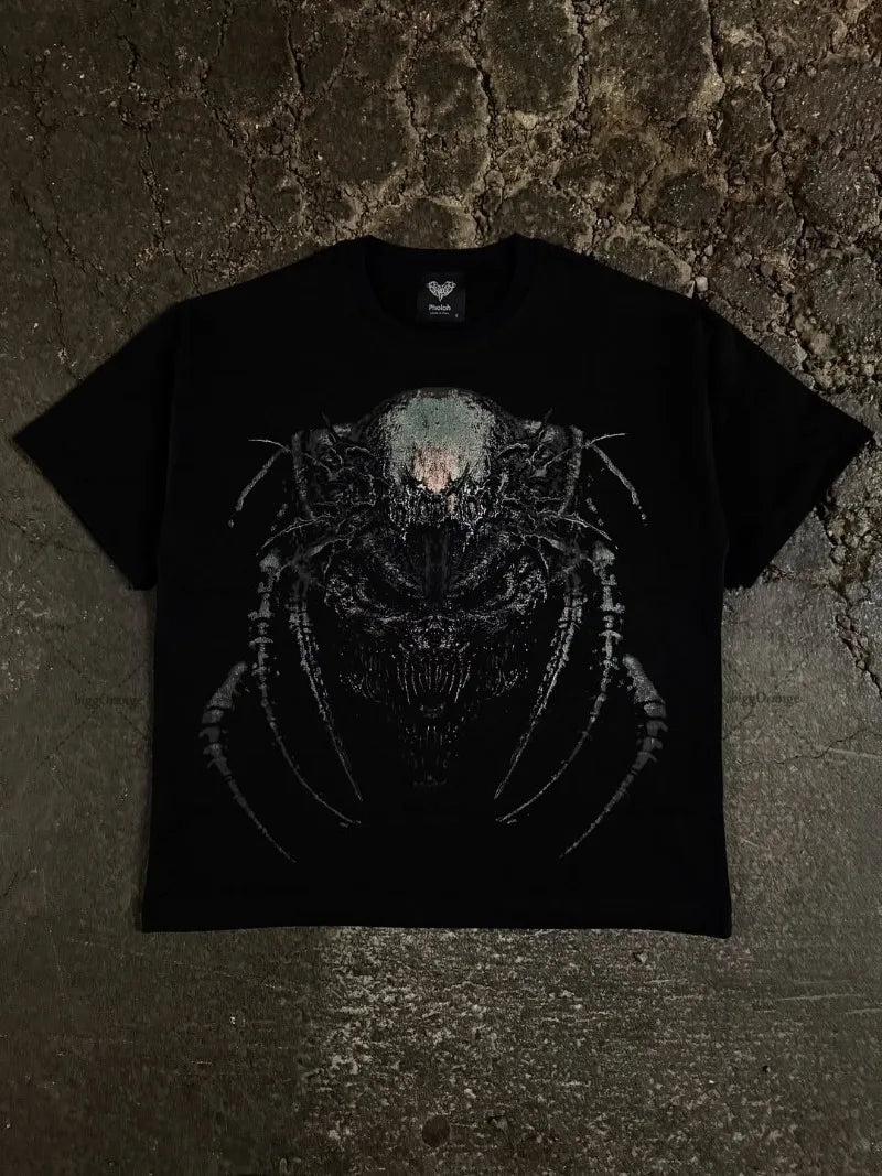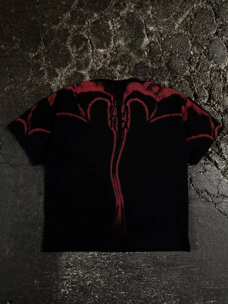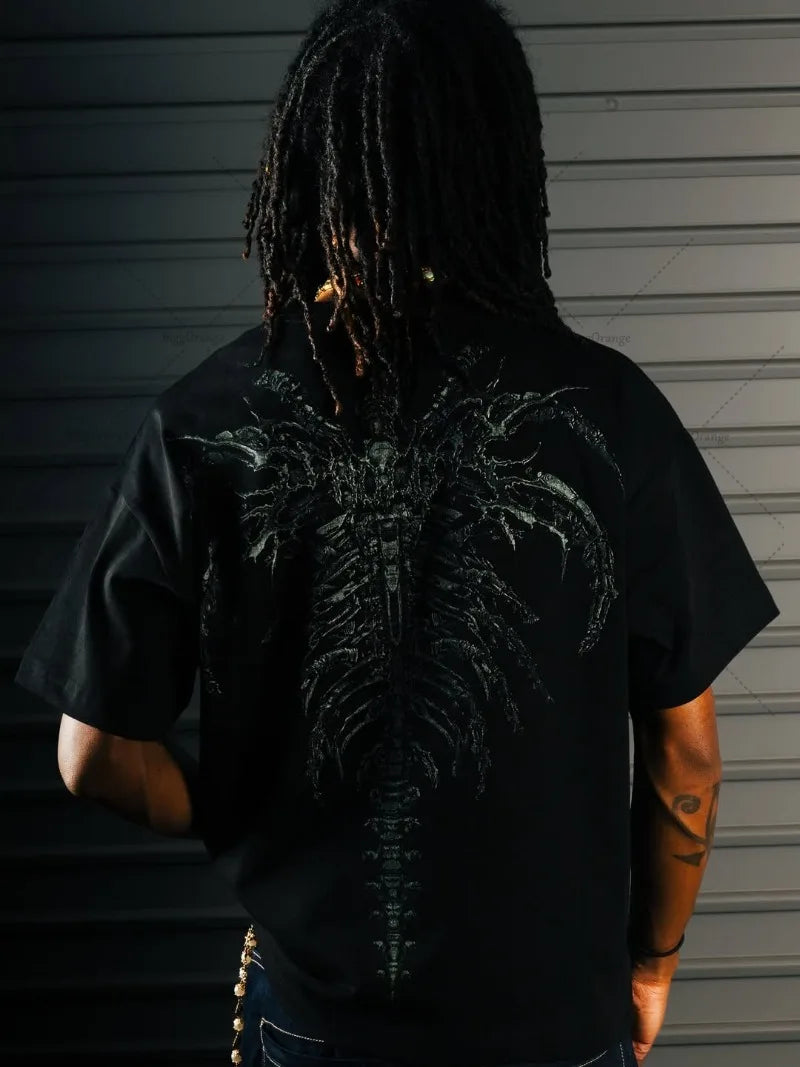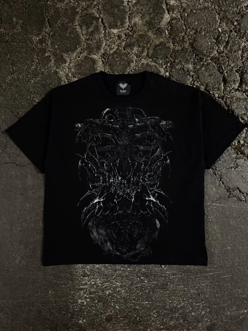 Diseño "Gothpunk" Gráfico y Enigmático: Esta playera no pasa desapercibida. Presenta una fusión de elementos gráficos que evocan la subcultura punk y gótica: piensa en tipografías desgastadas, calaveras estilizadas, o gráficos abstractos en tonos oscuros. Cada detalle grita originalidad, manteniendo la calidad y el toque DARK NIGHT.